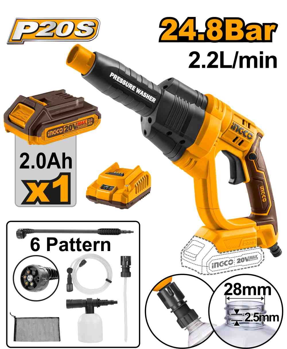 | Tension : 20 V Pression maximale : 24,8 bars Débit : 2,2 L/min Système d’arrêt automatique Batterie 1PCS 2.0AH 1PCS chargeur rapide Volts de charge : 220-240 V~50/60 Hz 1 ensemble pistolet pulvérisateur à 6 motifs 1 tuyau d’arrivée d’eau de 6 m avec connecteur rapide. 1 connecteur d’auto-aspiration 1 producteur de mousse de 400 ml 1 sac portable |
